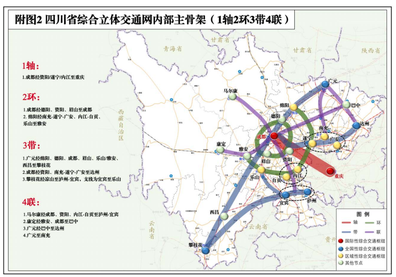 区域性综合交通枢纽。支持绵阳提升民用航空能级,完善军民融合交通保障体系。支持乐山参与共建巴蜀文化旅游走廊,推动乐山港升级打造为成都港。支持遂宁建设联动成渝的重要门户枢纽,推动遂潼川渝毗邻地区交通一体化发展。支持雅安打造川藏物资贸易集散地,建设绿色交通体系。推动内江—自贡交通同城化发展,支持内江建设成渝重要交通枢纽,支持自贡建设国家骨干冷链物流基地。支持南充建设成渝地区重要交通枢纽节点,提升成渝地区北部中心城市交通辐射带动力。支持广安打造川东渝北区域综合交通枢纽,推动全面融入重庆“1小时交通圈”,探索跨省域交通一体化发展。支持巴中建设成渝地区北向重要门户枢纽,夯实川陕革命老区振兴发展交通基础。支持甘孜、阿坝、凉山打造全域旅游交通体系,巩固交通脱贫攻坚成果,统筹推进川藏通道建设,强化战略通道安全保障能力,打通成渝至甘肃、青海的铁路、高速公路通道。支持凉山协同攀枝花建设四川南向开放门户枢纽,提升成渝昆走廊通道能级。