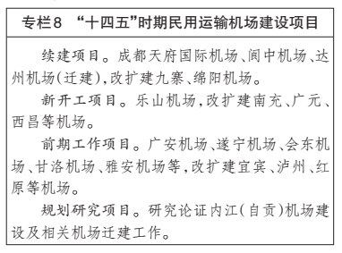 民用航空。加快完善“干支结合、客货并举”的民用运输机场布局体系。提升成都国际航空枢纽能级,建成投运成都天府国际机场,提升双流国际机场保障能力,实施“两场一体”运营模式,加快成都航空货运枢纽建设,完善航空货运专用设施。加密支线机场布局,促进机场间功能互补、差异化发展、一体化协作。建设平安、绿色、智慧、人文“四型机场”。