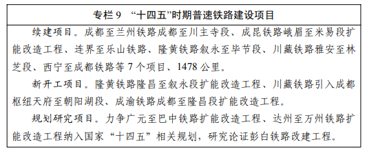 高速铁路。突破高速铁路瓶颈制约,打通多向出川高速铁路大通道,实施成达万、成自宜、渝昆、渝西等设计时速350公里的高速铁路项目,将成渝中线高铁打造为更高技术标准的高速铁路示范线路,全面融入国家“八纵八横”高铁网。打造轨道上的双城经济圈,加快城际铁路互联互通,实施成都都市圈环线铁路、绵阳至遂宁至内江铁路等项目。