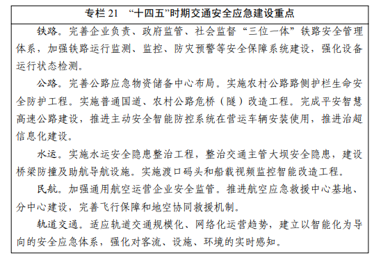 构建部门联动、多式协同、多方参与的综合交通应急管理体制机制,优化交通应急预案体系,完善全省综合交通运输运行调度和应急指挥平台。推动“5+8+N”交通应急物资储备中心和直升机救援力量建设,强化交通应急物资、设备储备,加强应急救援队伍建设。加强地震、地灾、洪灾、森林火灾、危化品运输泄露、重大疫情等领域的应急救援和运输保障演练。健全战略物资运输保障能力,提升供应链、产业链安全保障水平。