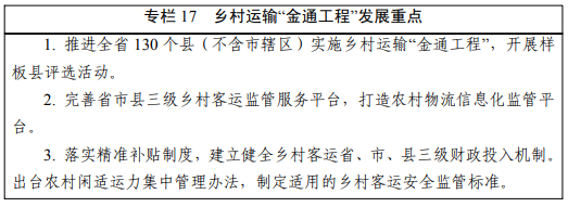 城乡客运。鼓励有条件的地区进行全域公交化改造,积极创建国家城乡交通运输一体化示范县。创新农村客运运营模式,完善服务标准和支持政策,推进“金通工程”全域覆盖和样板创建。深化实施“春风行动”。实施平安渡运工程。继续开好成昆铁路“慢火车”。
