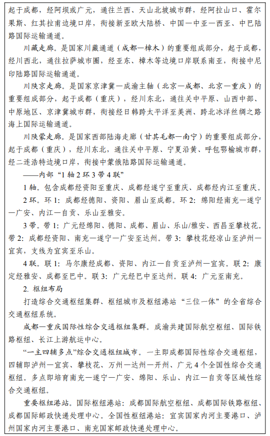 成都国际性综合交通枢纽。以成都国际航空港、国际铁路港为龙头,公路港、内河港为支撑,打造泛欧泛亚有重要影响力的国际门户枢纽。推进成都天府国际机场、成都双流国际机场一体运营,推动成都打造全球性航空枢纽、洲际航空中转中心和货运中心。提升成都铁路主枢纽能级,优化公路客货运枢纽布局,将成都港打造为以客为主、兼顾货运的国际知名旅游港口。支持德阳参与成都国际铁路港大港区建设,畅通成德临港经济产业带。支持眉山建设川滇藏货物陆水转运中心,共建天府新区公园城市绿色交通体系。支持资阳建设成渝门户枢纽,共建国际临空经济区。