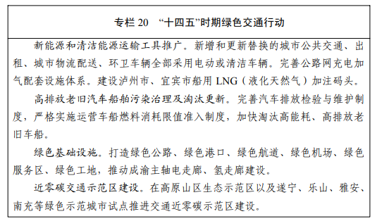 制定交通运输“碳达峰”行动方案。持续推进运输结构调整,加快“公转水”“公转铁”,减少公路大宗货物长距离运输比重。加大新能源和清洁能源车船装备推广应用力度,布局高速公路、国省道沿线和综合客货枢纽充电、换电、加氢基础设施,形成连接全省主要城市的城际快充网络;聚焦重型卡车、大型客车等重点领域,大力推广电动汽车换电模式。推广“碳惠天府⑧”,引导居民绿色出行,开展绿色出行创建行动。大力发展城市绿色货运配送。严格落实碳排放控制政策,建立绿色低碳交通统计监测核算体系。