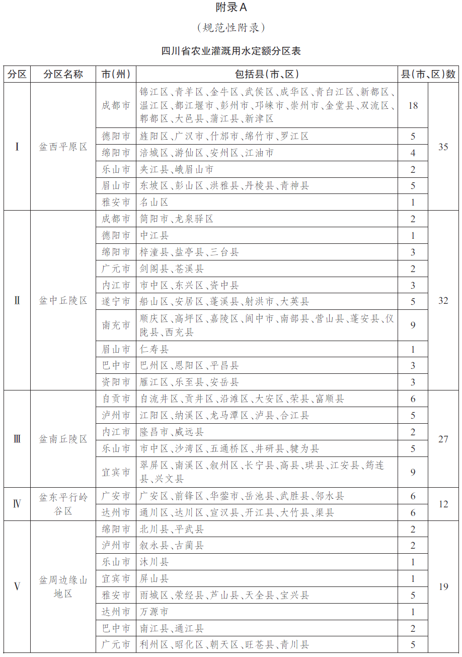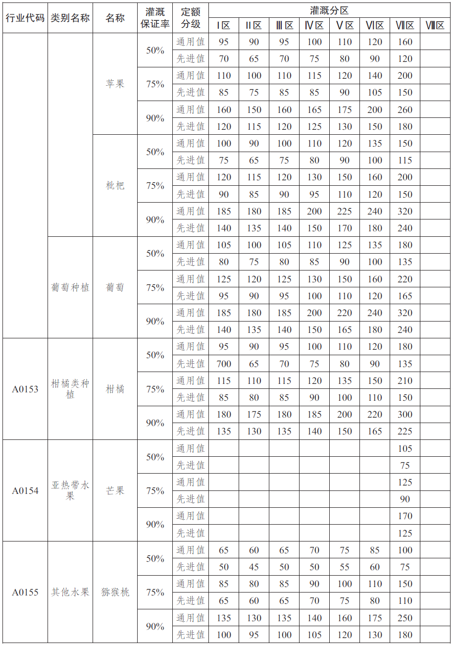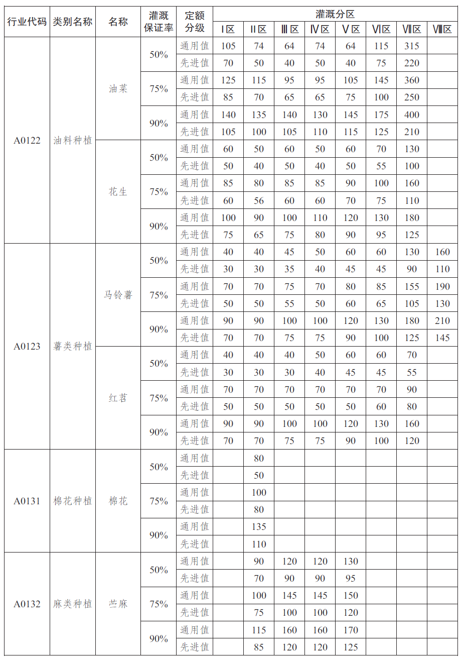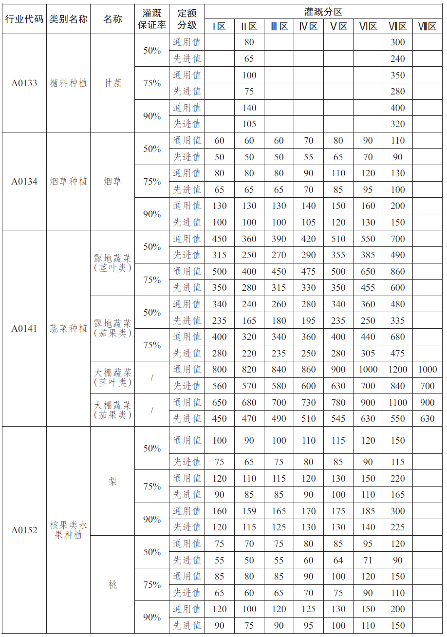 农业用水定额见表1~表5,具体灌溉分区情况见附录A。