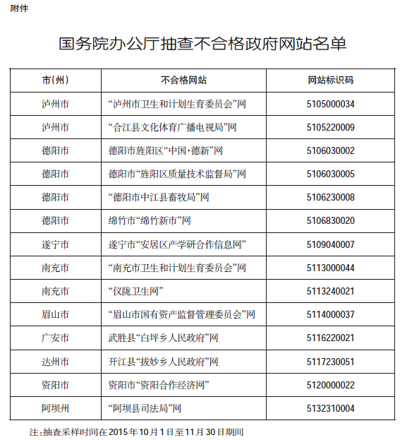 近日,国务院办公厅印发《关于第一次全国政府网站普查情况的通报》(国办函〔2015〕144号),在我省抽查的278个政府网站中,泸州、德阳、遂宁、南充、眉山、广安、达州、资阳、阿坝等9个市(州)的14个政府网站抽查不合格。现就检查整改工作提出如下要求。