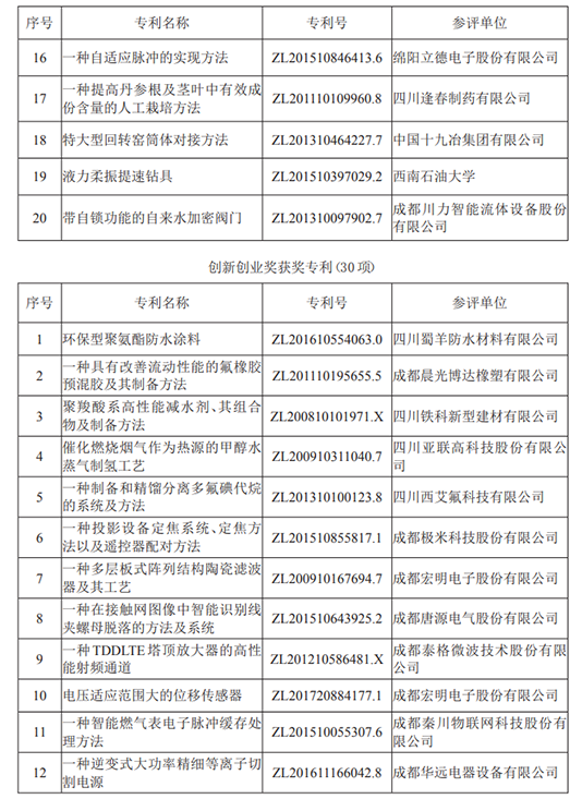 2019年,各地各部门(单位)坚持以习近平新时代中国特色社会主义思想为指导,全面贯彻党中央国务院和省委省政府的各项决策部署,加快培育创新驱动新优势,深入推进引领型知识产权强省建设,促进专利技术更好地转化为现实生产力。为激励先进、鼓舞干劲,根据《四川省专利实施与产业化激励办法》(川办发〔2019〕58号),经四川省专利实施与产业化奖(以下简称四川专利奖)评审委员会评审,省政府决定授予“一种悬浮法聚四氟乙烯树脂的粉碎设备和粉碎方法”等5项专利为四川专利奖一等奖,授予“多功能人脸抓拍比对服务器”等11项专利为四川专利奖二等奖,授予“一种高炭黑分散度聚乙烯粒料及其制备方法”等20项专利为四川专利奖三等奖,授予“环保型聚氨酯防水涂料”等30项专利为四川专利奖创新创业奖,对相关企事业单位予以通报表扬。